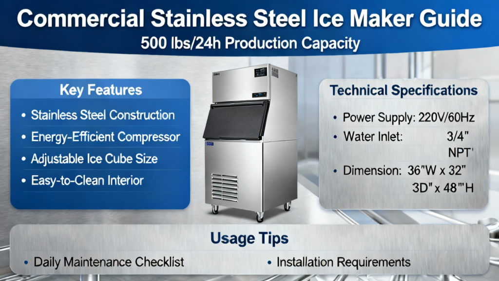 Commercial Stainless Steel Ice Maker Guide, 500 lbs/24h