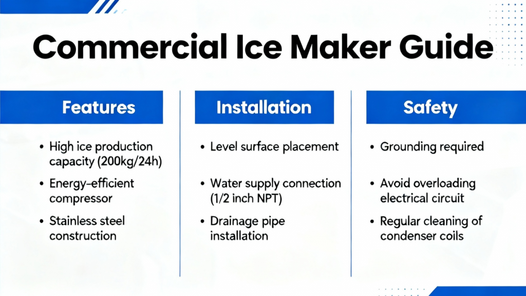 In summary, integrating a heavy-duty commercial ice maker into your business is a significant investment that demands careful attention to detail. From its robust stainless steel build and eco-conscious R290 refrigerant to the non-negotiable installation requirements of proper clearance, dedicated power, and precise water pressure, each specification is designed to guarantee reliability. The critical safety protocols—especially the 24-hour settling period and proper grounding—are essential to prevent operational failures and hazards. By meticulously following the guidelines for drainage, ambient temperature management, and using only a potable water source, you ensure the unit operates at peak efficiency, delivering the consistent ice supply that hospitality and food service operations depend on. Ultimately, choosing a well-engineered commercial stainless steel ice maker and installing it correctly isn’t just about making ice; it’s about ensuring seamless service, safeguarding your investment, and supporting the relentless pace of a successful commercial environment.